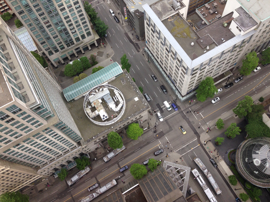 Nach einem asiatischen Mittagessen schauten wir uns dann Vancouver von ganz oben an! Vom sog. Vancouver Lookout hatten wir tatsächlich einen fantastischen Blick auf die Stadt und sogar das nähere