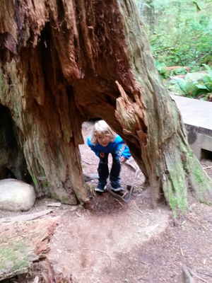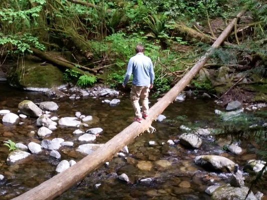 Wäldern, kalten Bächen und sehr hohen Bäumen. Dominic ließ es sich (natürlich) nicht nehmen, einen solchen Bach mehrmals auf einem Baumstamm balancierend zu überqueren, den Rückweg nahm er mit