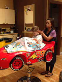 beimKinderfriseur hatte. Im Lightning Mac Queen und mit laufendem Fernseher, bekam er dann einen neuen, von ihm gewählten Haarschnitt verpasst...