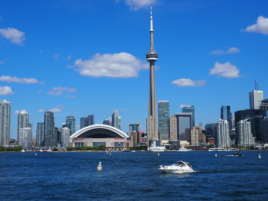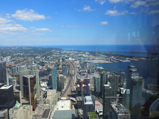 dem Fernsehturm von Toronto. Oben angekommen kann man an Glaswänden einmal im Kreis rund um den Turm laufen. Auf der einen Seite hat man einen tollen Blick auf den Lake Ontario, auf der anderen Seite