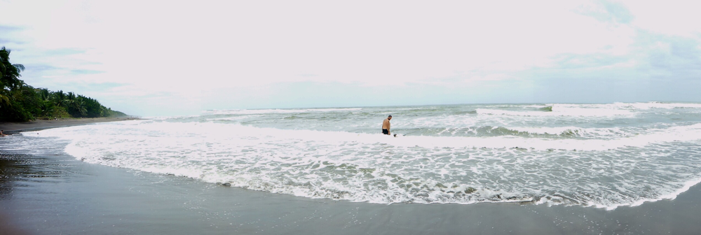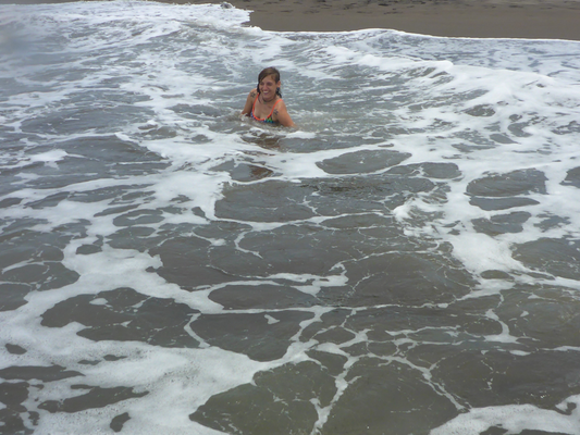 an.Nach einem Frühstück und Erholung in der Hängematte gingen wir an den Strand. Hier auf Tortuguero ist der Sand übrigens schwarz und dementsprechend sehr heiß. Also stürzten wir uns in die
