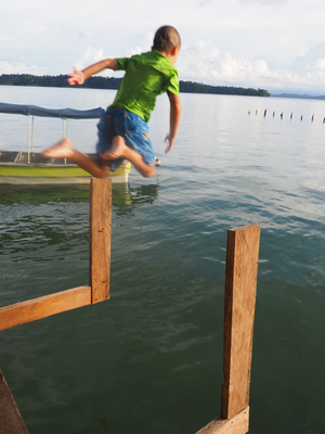 Da heute tatsächlich ein sehr warmer Tag war, verbrachte Noah die nächsten Stunden damit, vom Steg des Hostels todesmutig ins Meer zu springen und seinen Papa im Wasser zu ärgern.