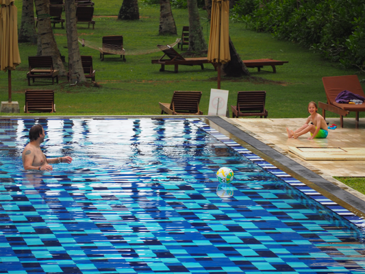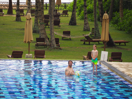 Da der Monsun gerade beginnt, haben wir zur Zeit viel Regen und Wind. Trotzdem ist es um 27 Grad warm und deshalb hüpfen wir jetzt auch in Pool. (Am Strand weht zur Zeit die rote Flagge)