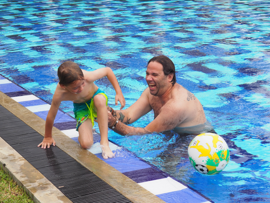 Wir sind heute morgen aufgestanden und haben gefrühstückt dann sind wir in den Pool gehüpft. Dann haben wir Ball gespielt. Wir sind dann